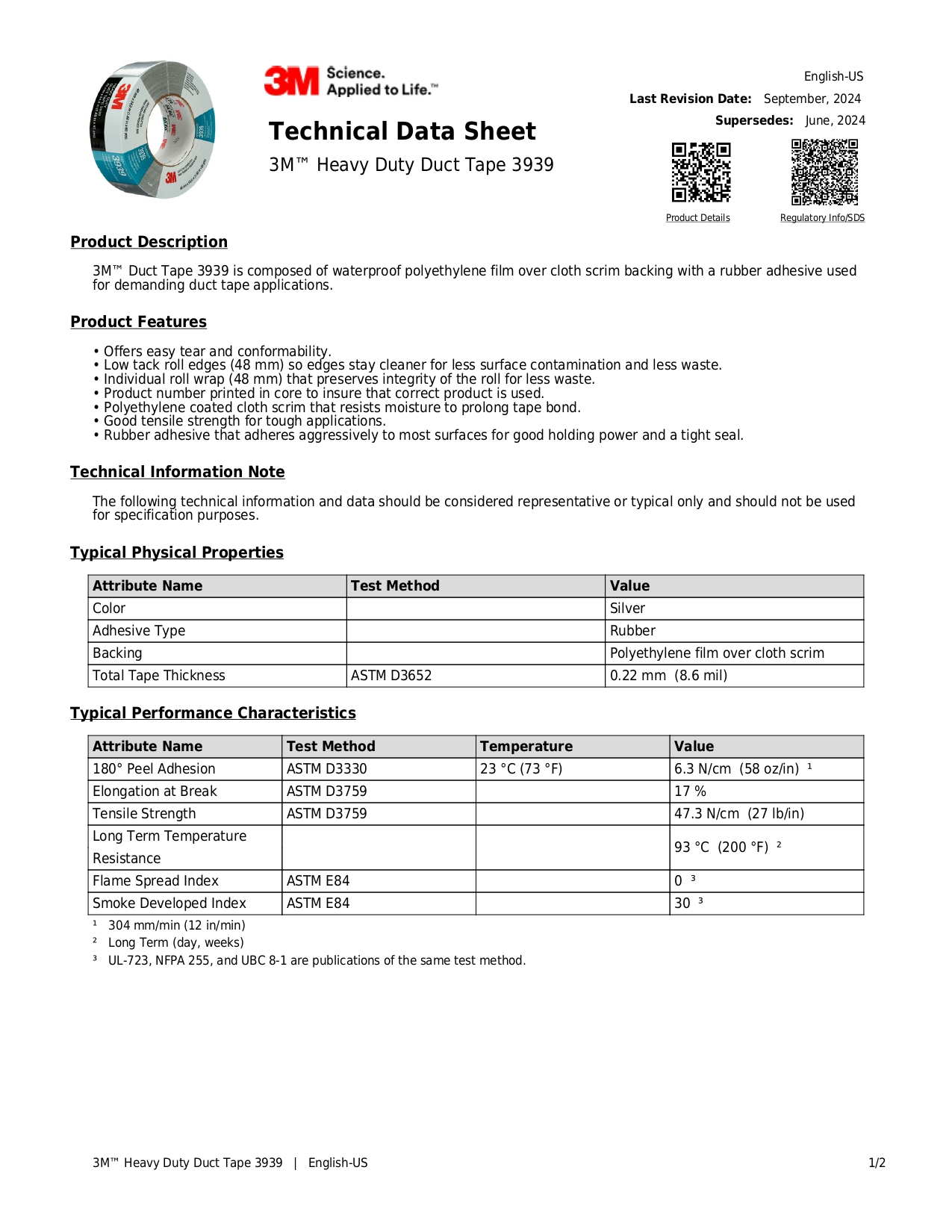 3M™ Heavy Duty Duct Tape 3939 can be used in temperatures up to 200 degrees F. It has been burn tested according to the methods UL 723, ASTM E-84, NFPA 255, UBC 8-1. Results were Flame Spread Index 0, Smoke Developed Index 30.