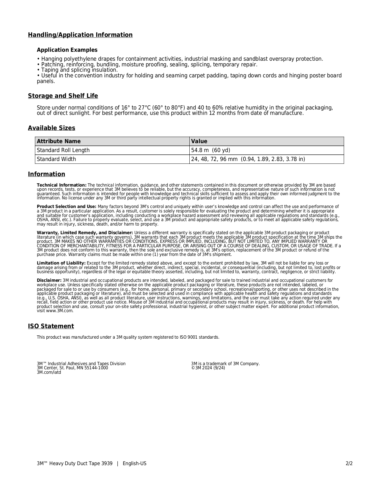 3M™ Heavy Duty Duct Tape 3939 is constructed of a water-resistant polyethylene laminated to cloth reinforcement and backed by an aggressive natural-rubber adhesive; the tape is high-tack and conformable. Our tape tears easily and cleanly—horizontally or vertically—without slivering. Industrial applications include hanging polyethylene drapes for containment activities, masking and sandblast overspray protection. It is also used in the convention industry for holding and seaming carpet padding, taping down cords and hinging poster-board panels.
