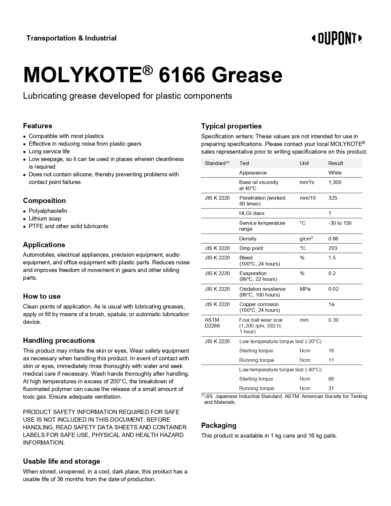 MOLYKOTE® 6166 Grease is a silicone-free, polyalphaolefin (PAO)-based grease thickened with lithium soap.The grease includes white solid lubricants, designed to reduce noise and provide smooth, low-friction performance.Primarily developed for plastic components, particularly plastic gears, known for their susceptibility to wear and noise amplification. It’s widely recognized for its noise-reducing properties, excellent adhesion, oxidation resistance, and compatibility with plastics, rubbers, and water-prone environments.